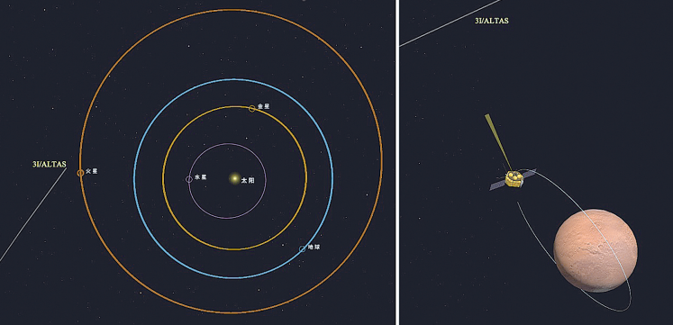 图为星际天体阿特拉斯与天问一号火星环绕器相对位置示意图(右图是2025年10月3日相机拍摄时左图的局部放大)。国家航天局提供