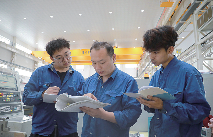 图为3名缠绕操作人员正在交流探讨各自发现的问题隐患。郑蕊 摄