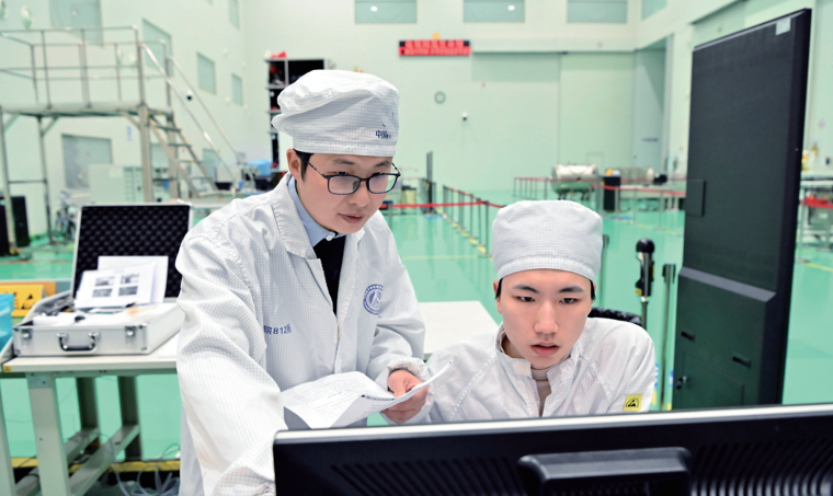 卫星团队成员在电脑前热烈研讨,仔细推敲卫星热试验前改装的每一个细节,以奋斗践行使命,确保高质量达成任务目标、守住研制节点。
