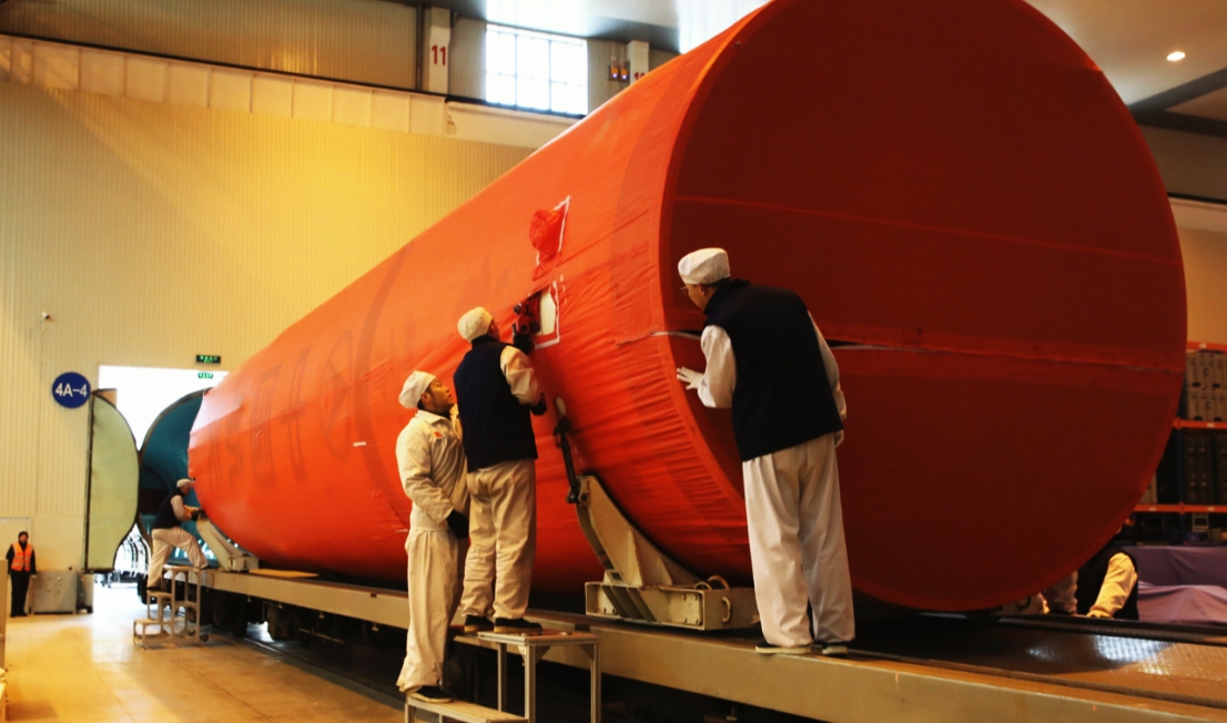 图为中国航天科技集团有限公司一院211厂总装事业部员工正在开展火箭二级装车前的准备工作。吕思寒 摄